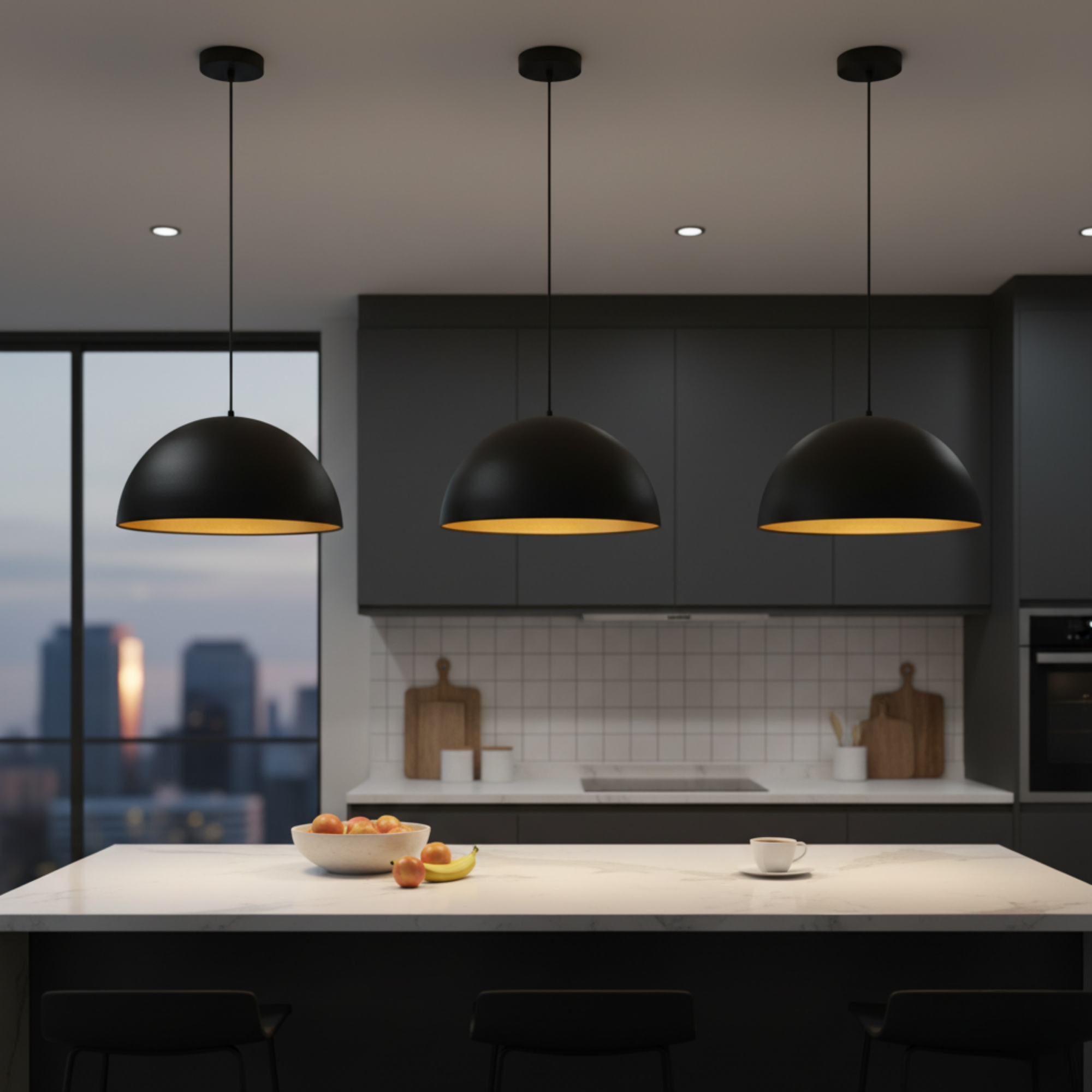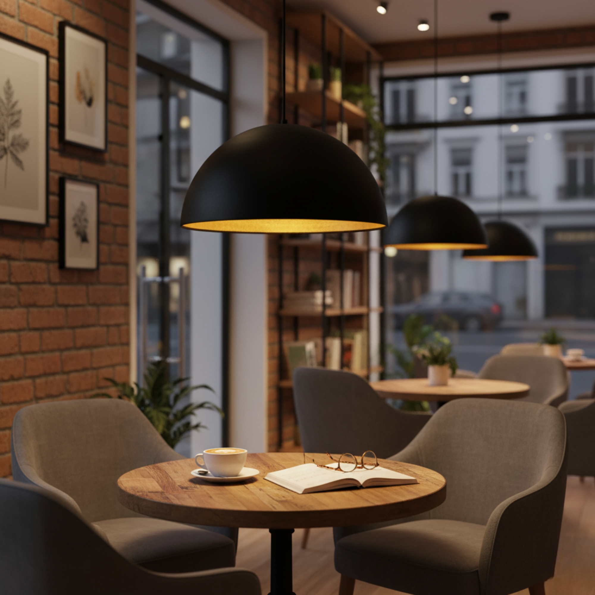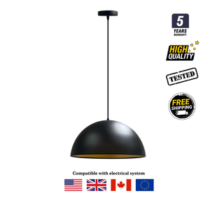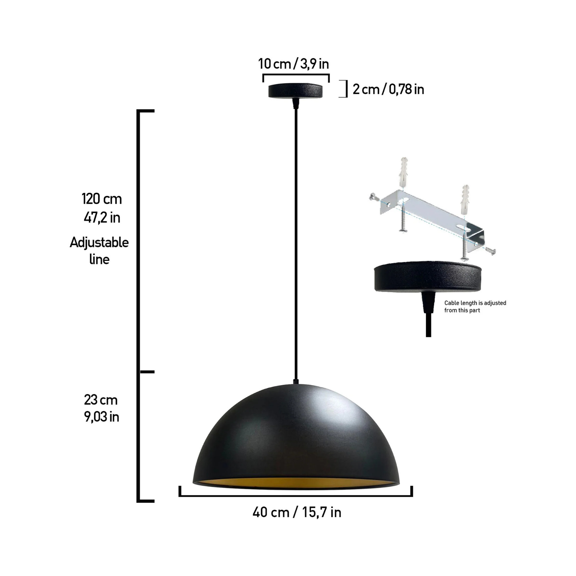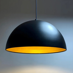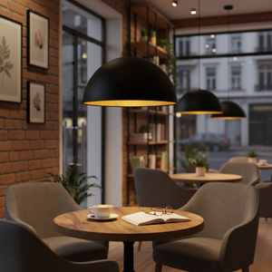 The matte black dome exterior contrasts beautifully with the gold-finished interior, creating a warm, inviting glow that enhances any space. With its 40 cm (15.7") wide shade and adjustable 120 cm cable, it adapts effortlessly to both modern homes and sophisticated commercial interiors.