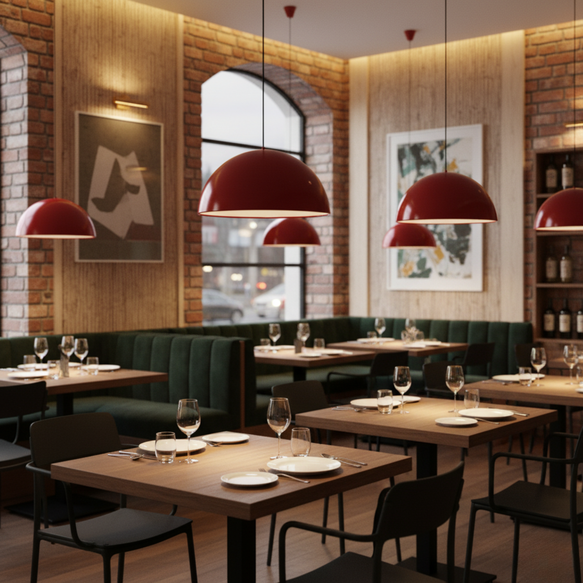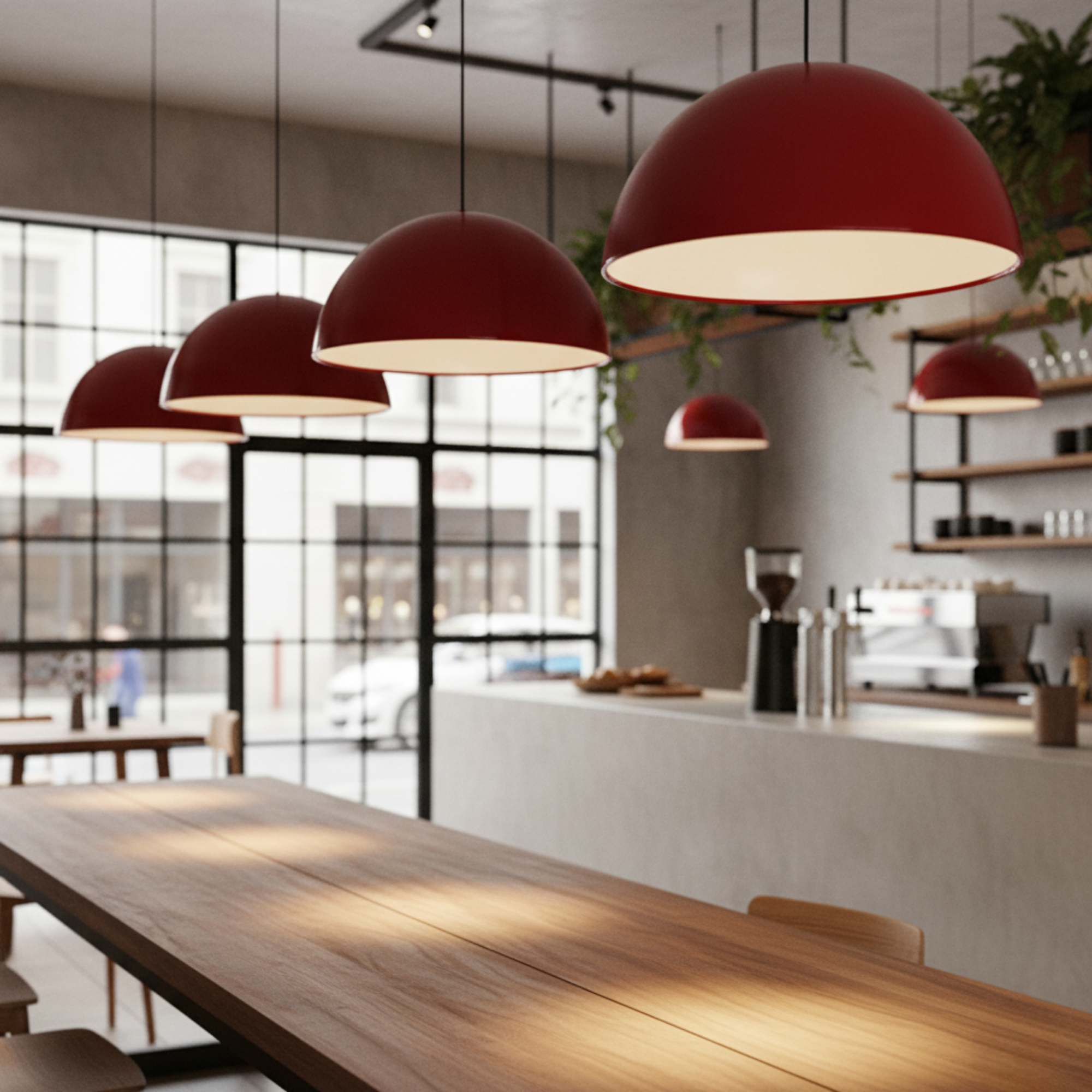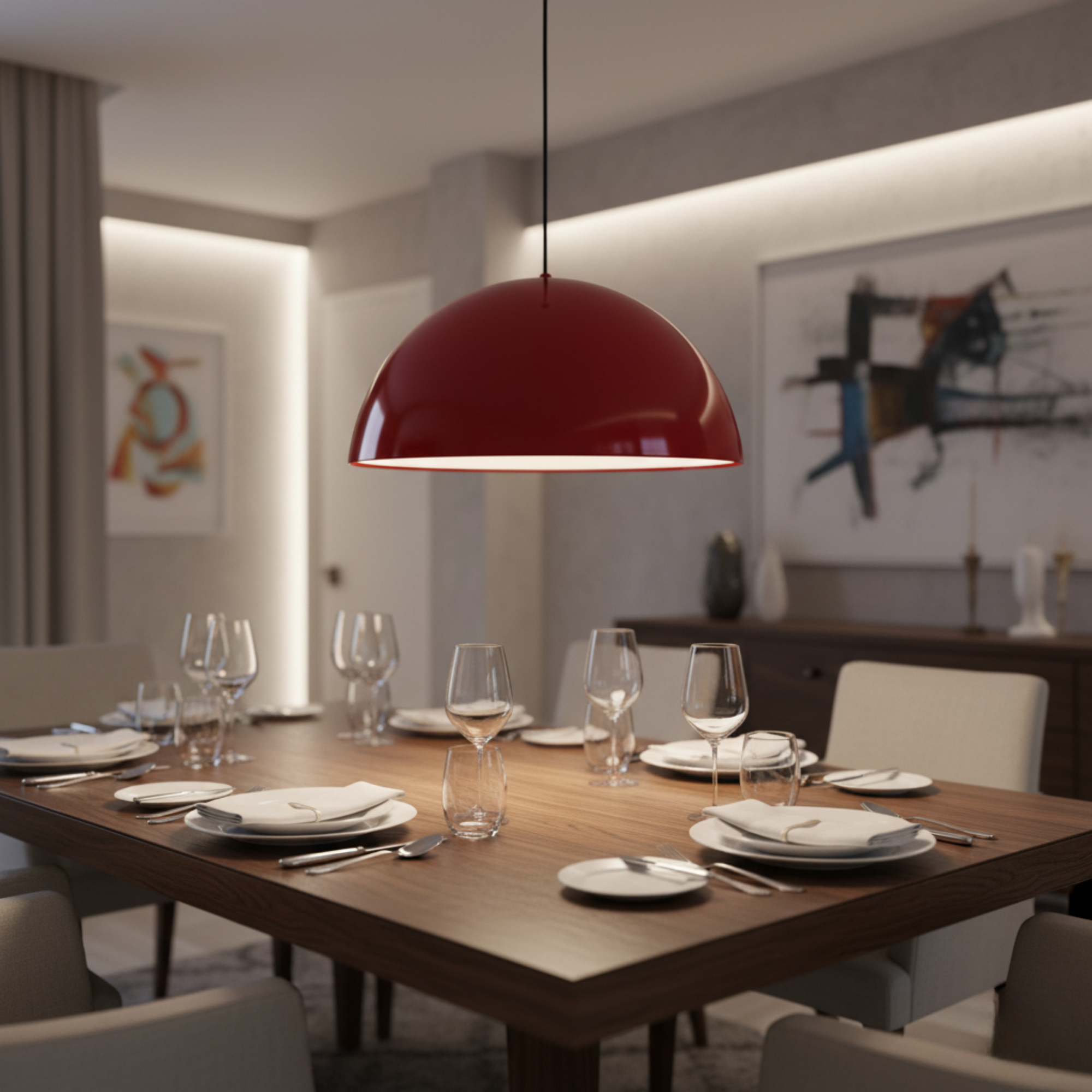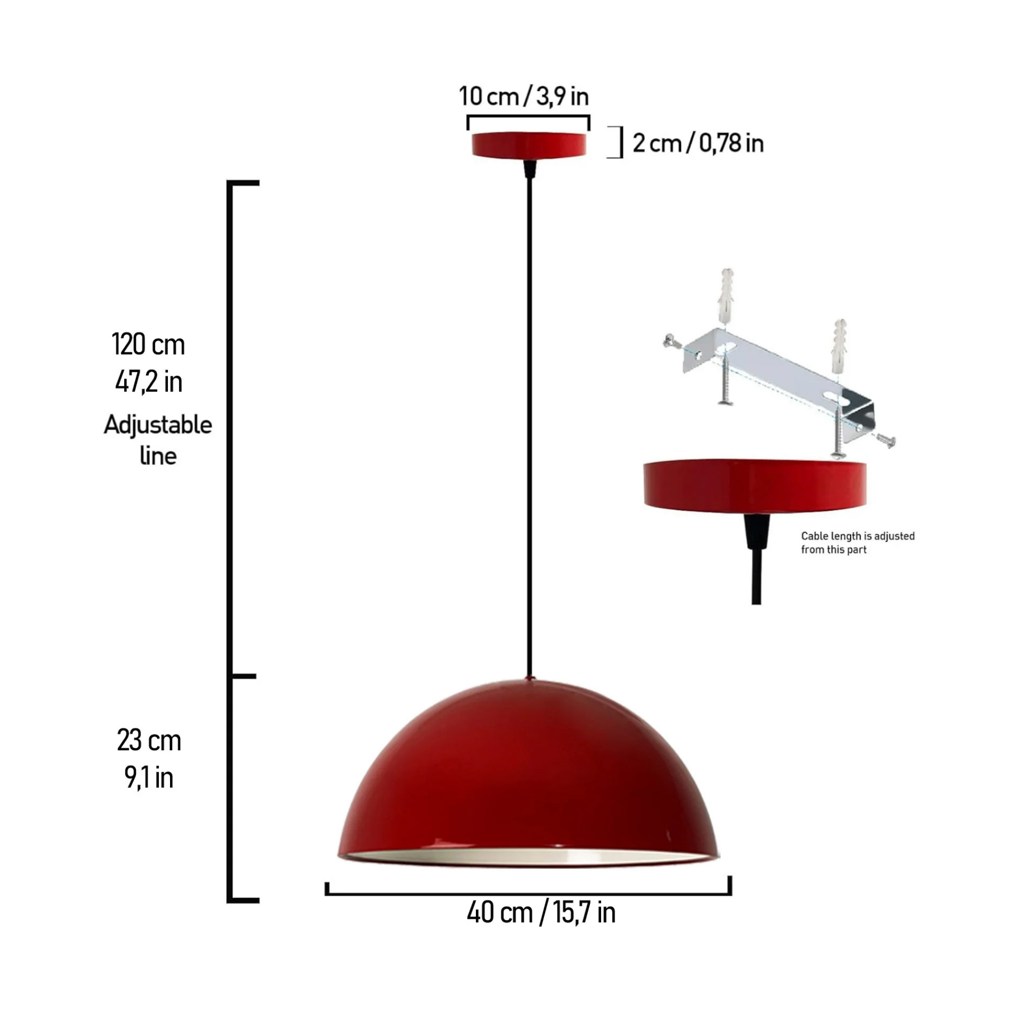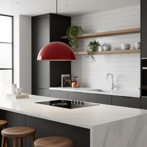 The dark red exterior adds richness and sophistication, while the matte white interior provides a soft, even glow that brightens any room without glare. With its large 40 cm dome shade and adjustable 120 cm hanging cable, this pendant adapts effortlessly to both residential and commercial interiors.